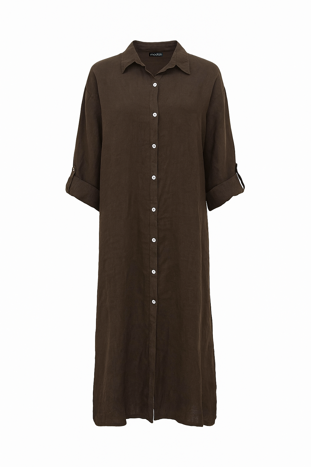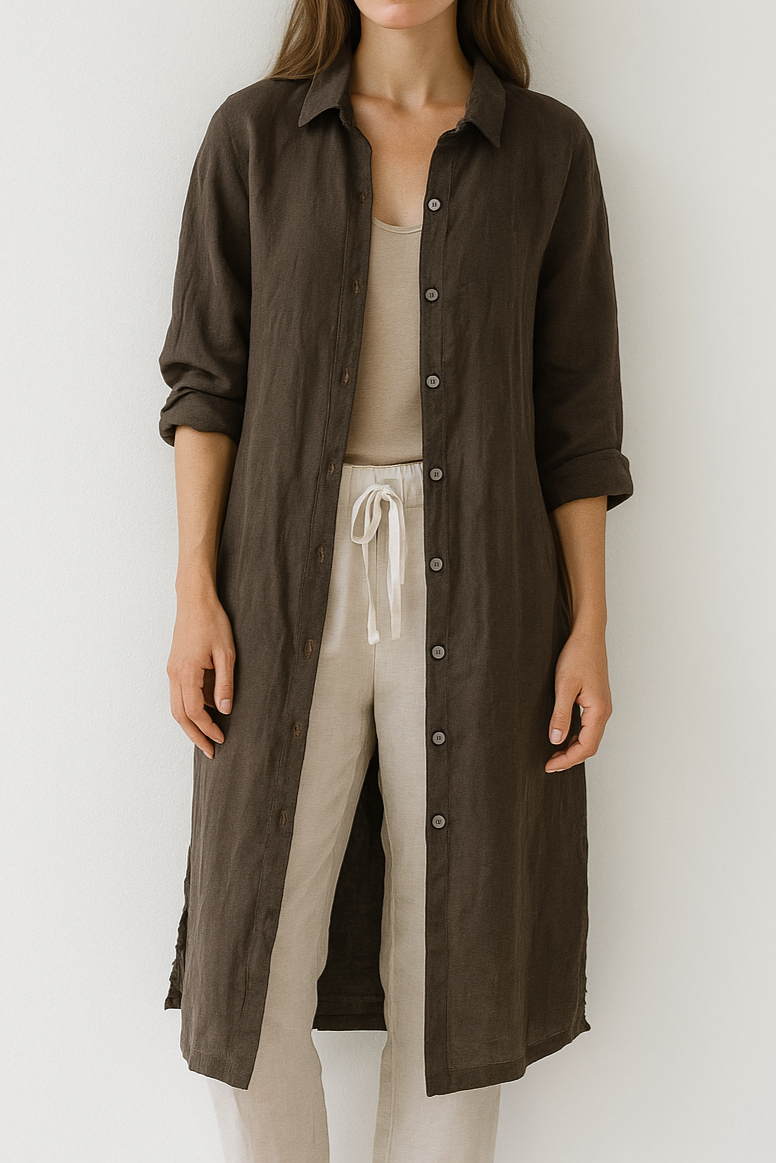 Camicia lungo in lino, dal taglio dritto e minimale. Presenta una chiusura frontale con bottoni bianchi, colletto classico e maniche lunghe arrotolabili.