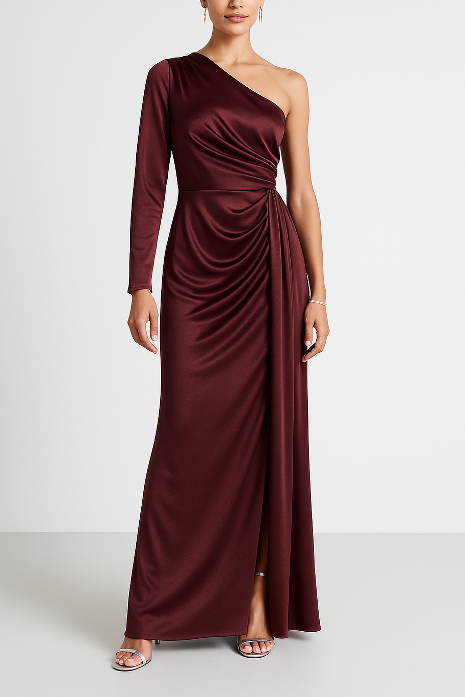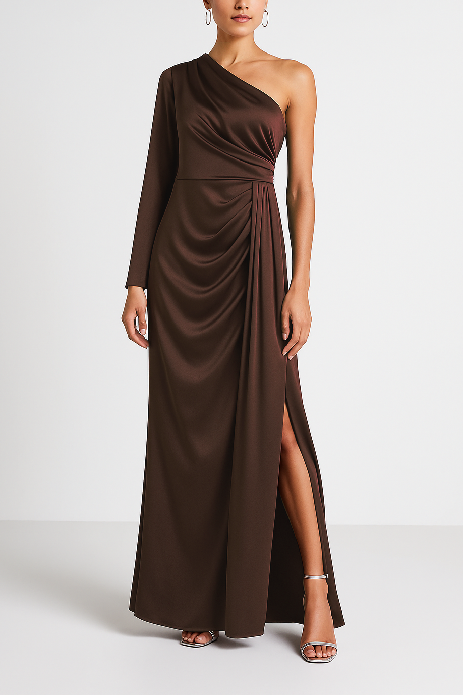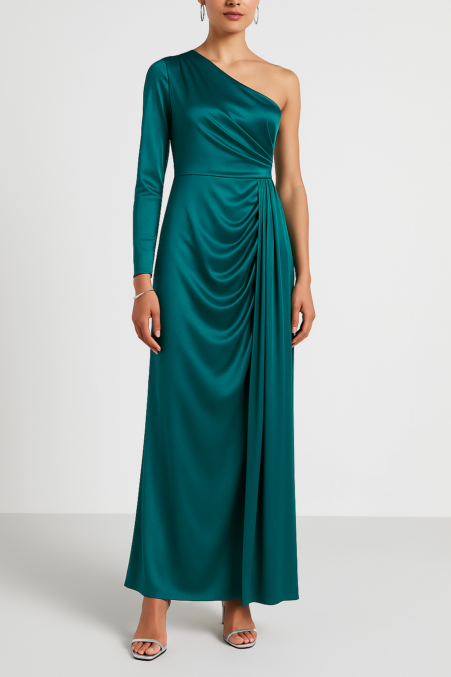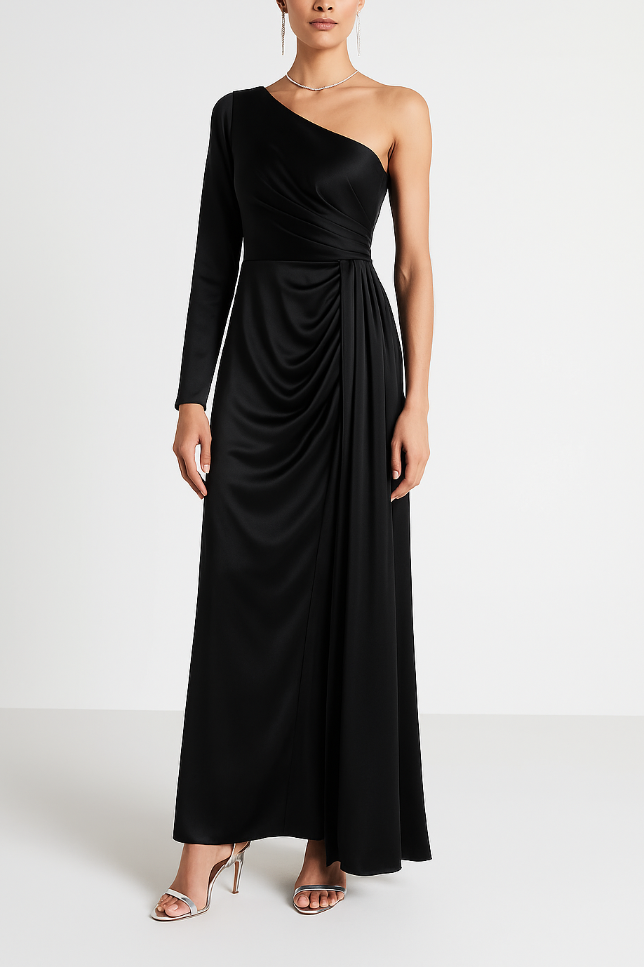 DESCRIZIONE: Abito da sera monospalla in raso fluido. Il corpetto è drappeggiato e scende in una cascata laterale che valorizza il punto vita e i fianchi. Lunghezza maxi, silhouette elegante e scenografica per cerimonie ed eventi.