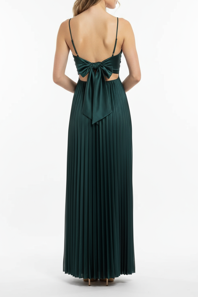 Abito lungo in tessuto satinato color smeraldo, caratterizzato da un corpetto arricciato con sottili spalline regolabili, il retro presenta una seducente apertura con maxi fiocco da annodare, che aggiunge un tocco sofisticato e femminile. Perfetto per occasioni speciali, serate eleganti e cerimonie.