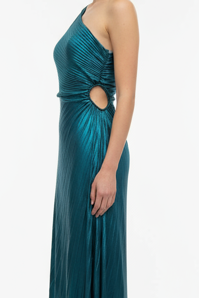 Abito plisse monospalla asimmetrico, con il dettaglio cut-out laterale aggiunge un accento audace e femminile.