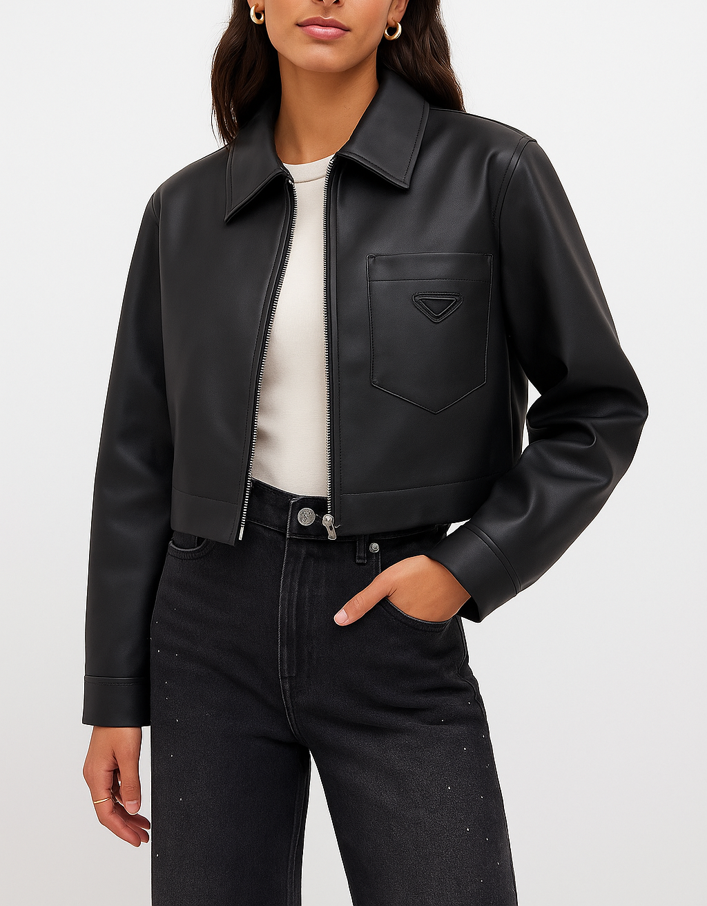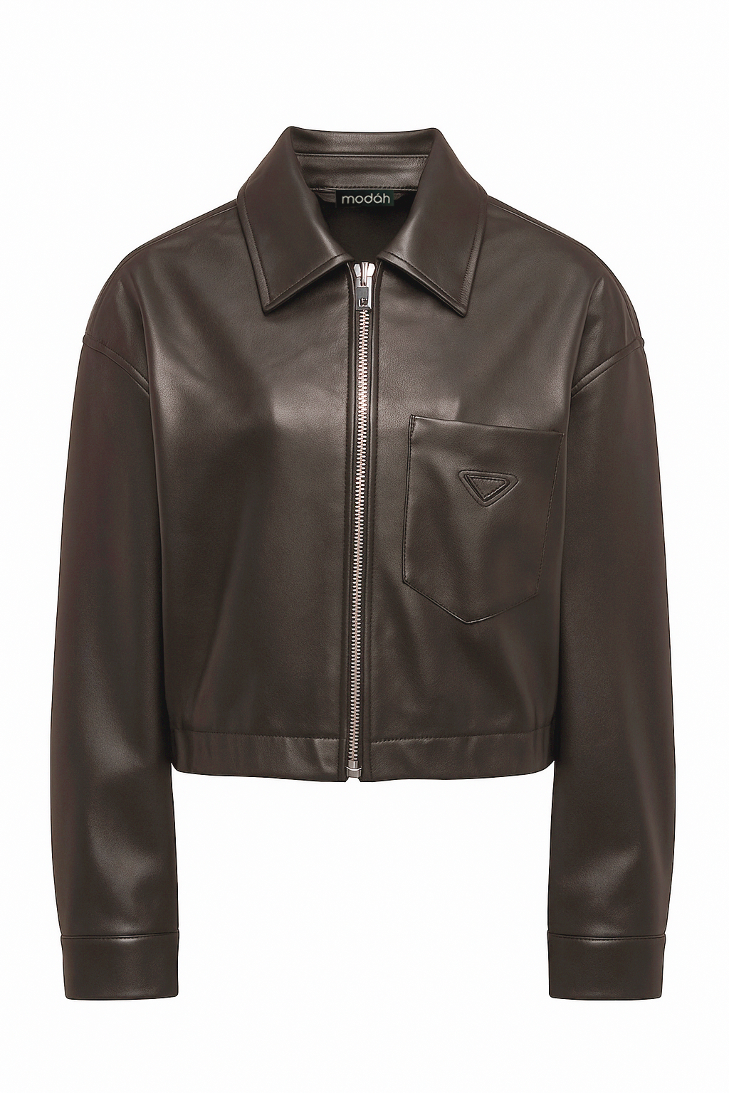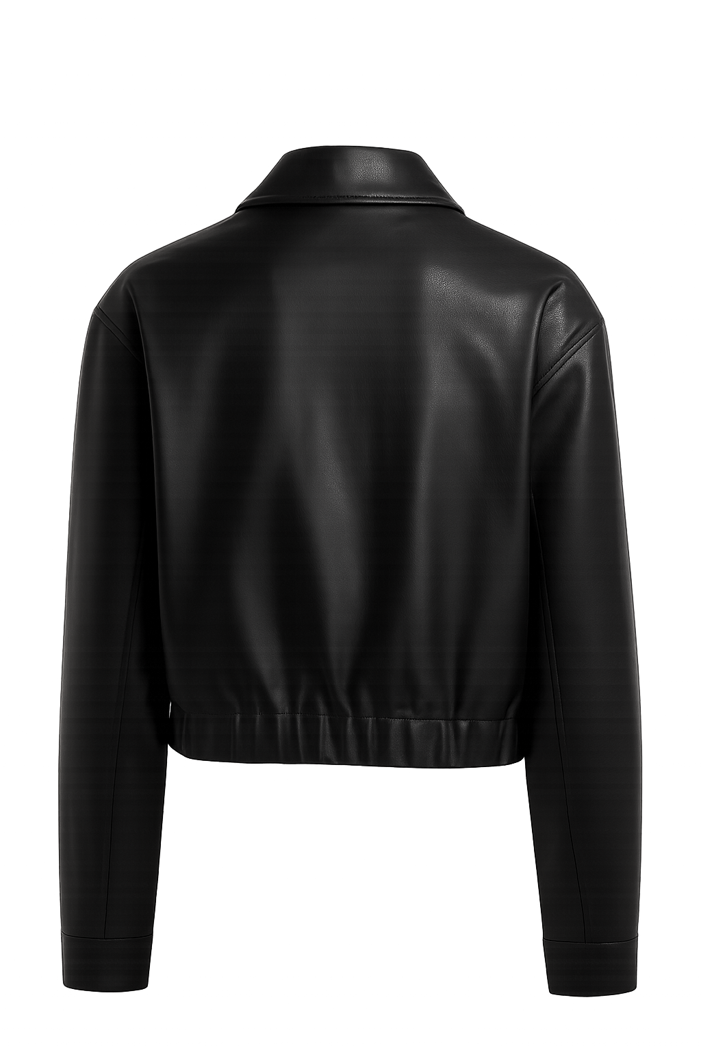 DESCRIZIONE:Giacca in eco-pelle liscia dal taglio corto, chiusa da zip metallica. Colletto a camicia, spalle scese, taschino applicato sul petto e fondo con elastico che definisce la linea. Un ibrido tra bomber e overshirt: pulita, moderna, facile da portare tutti i giorni.