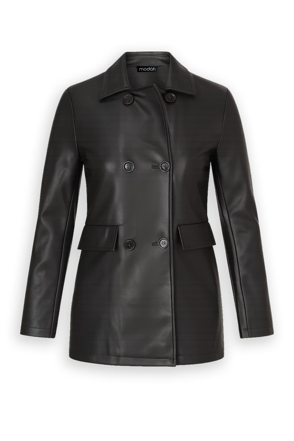 DESCRIZIONE: Giacca in eco-pelle dal finish semi-lucido, linea dritta e allungata. Il doppio petto con 6 bottoni e il colletto a camicia le danno un carattere pulito e contemporaneo: facile da usare sia con denim sia sopra look più eleganti.