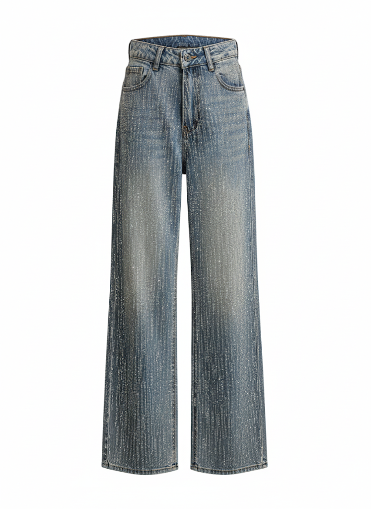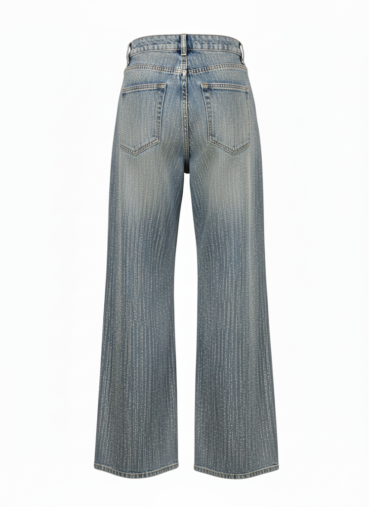 Jeans wide leg con applicazioni strass, denim blu chiaro con lavaggio vintage, arricchito da un’applicazione di strass verticali su tutta la lunghezza fronte e retro.