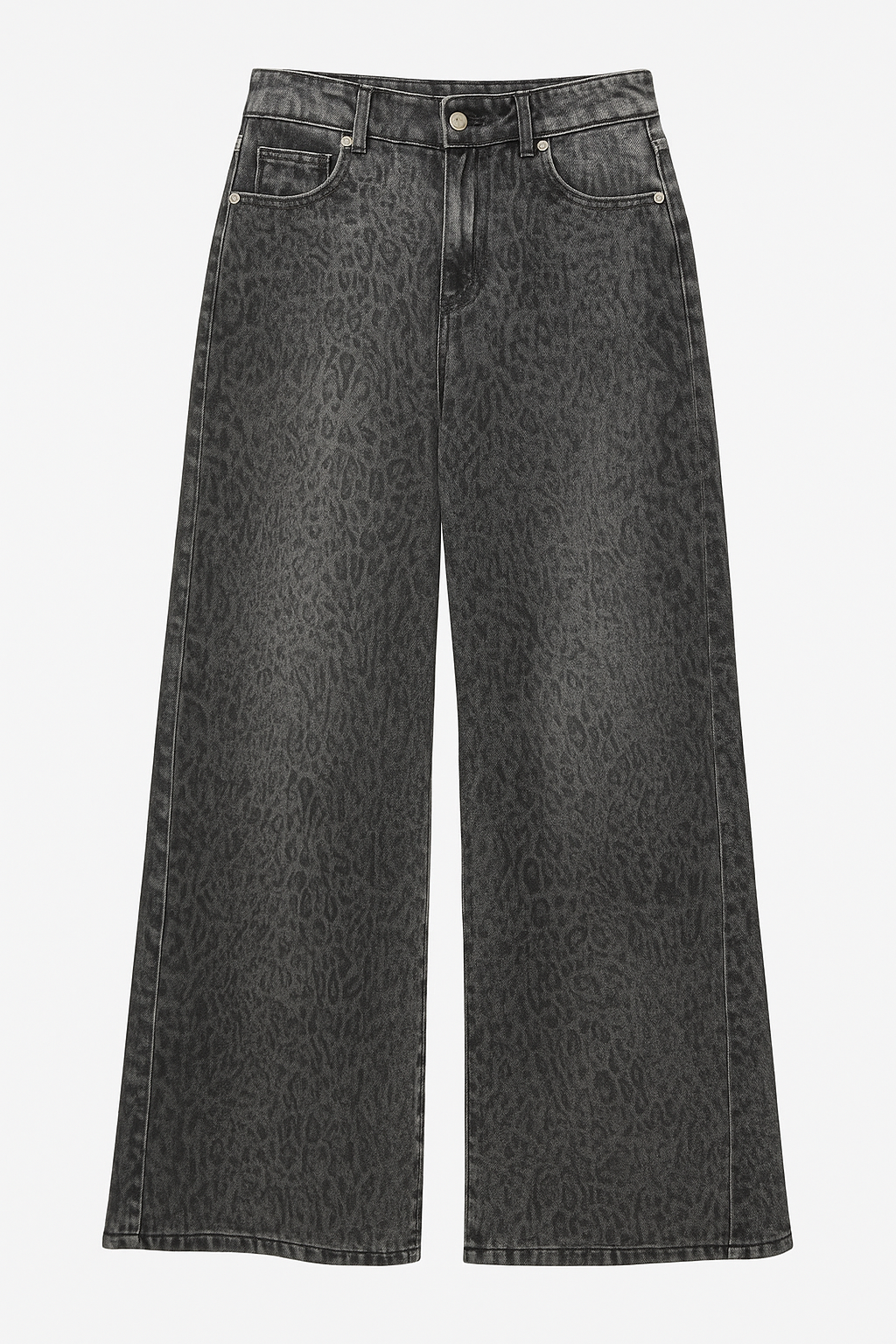 Jeans in denim grigio vita alta con stampa maculata all-over effetto tono su tono. Il taglio dritto e la gamba larga morbida rendono questo modello contemporaneo e versatile, perfetto per dare un tocco grintoso ai look di ogni giorno.