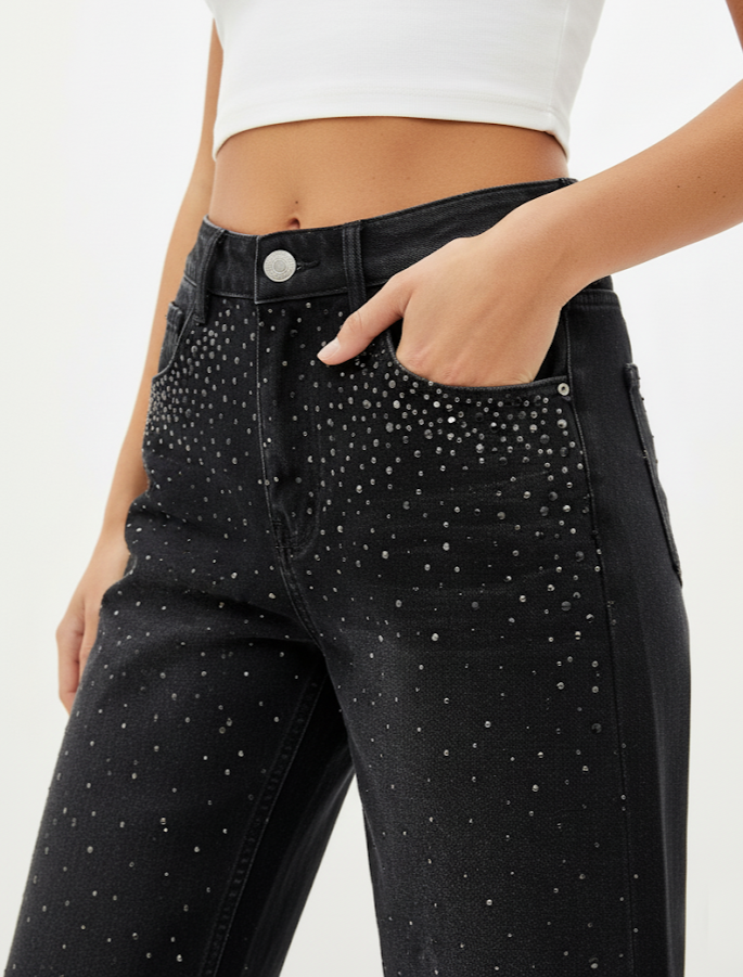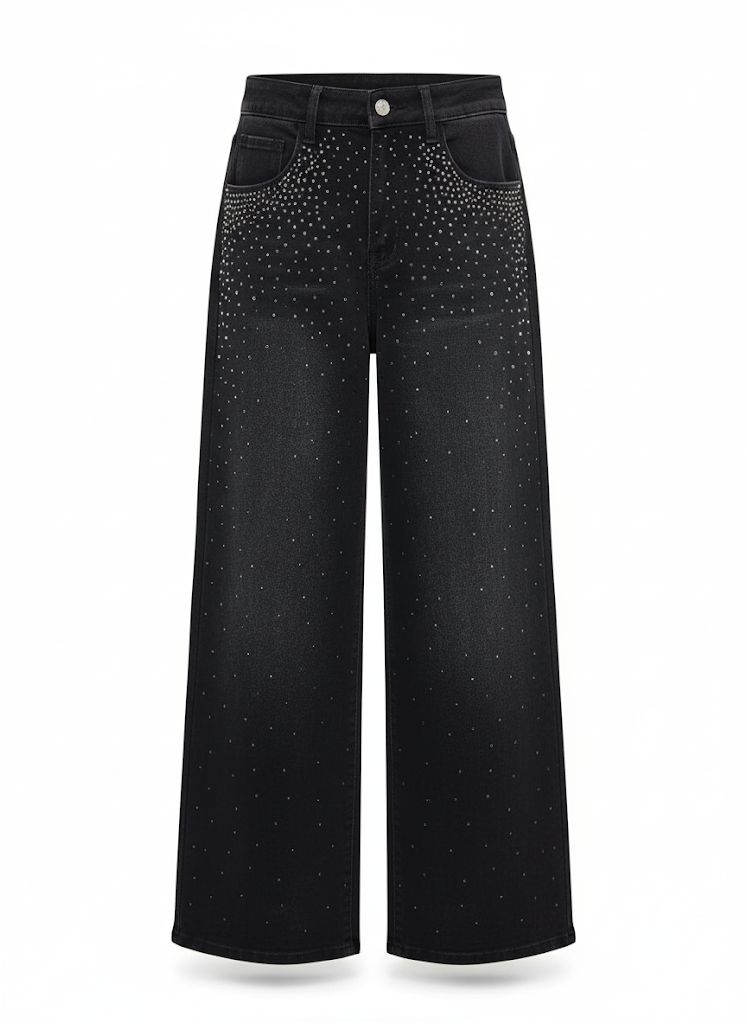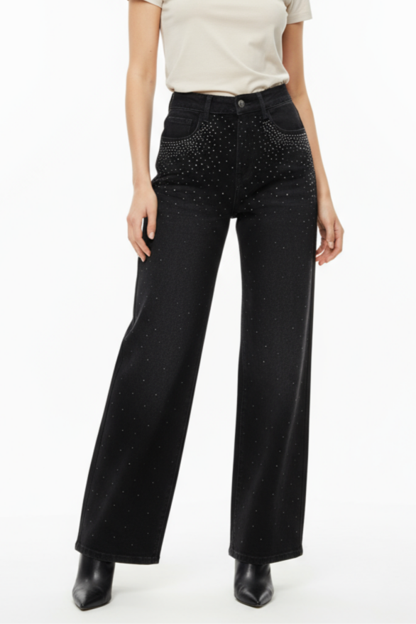 Jeans Wide Leg neri vita alta con strass alle tasche frontali