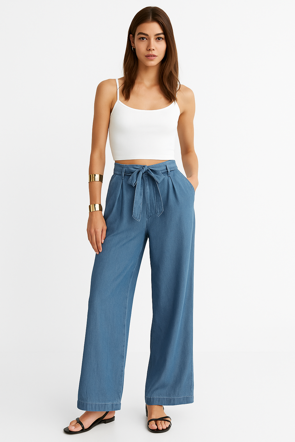 pantaloni modello palazzo, realizzati in 100% Lyocell. Il tessuto, simile al denim ma molto più leggero e morbido, conferisce un effetto fluido e cadente.